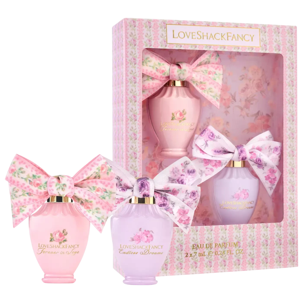 Descripción del set: Descubre tu nuevo perfume exclusivo con el dúo de mini réplicas imprescindibles de Forever in Love y Endless Dreams. Forever in Love es el floral afrutado definitivo; un perfume digno de desmayo con pera verde y gardenia. Endless Dreams es un cálido y desbordante jardín floral con fresa, jazmín y vainilla de Tahití.